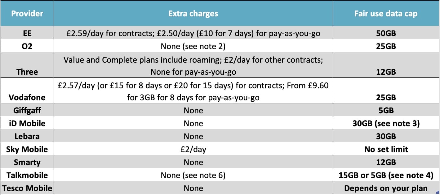 (1) Most firms limit the amount of data you can use abroad – see all providers’ fair use policies for full information.
